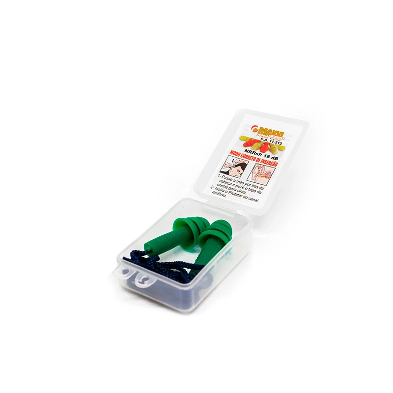 Protetor auditivo, confeccionado em silicone grau farmacêutico, tipo inserção, composto de um eixo com três flanges, onde a primeira, a segunda e a terceira, são flanges maciças e cônicas, todas de dimensões variáveis, em cujo eixo contém um orifício até o seu interior. Protetor tamanho único, moldável a diferentes canais auditivos.