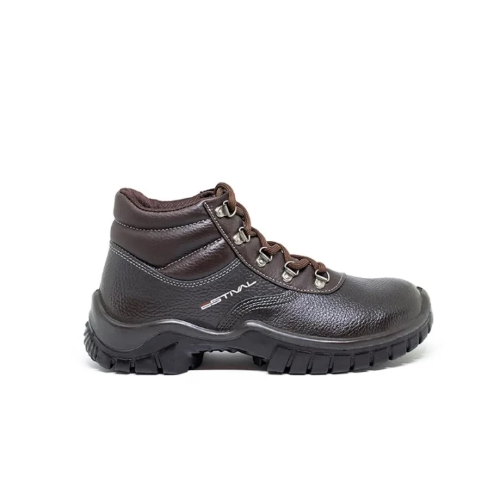 Calçado tipo bota para proteção dos pés confeccionado em couro relax curtido ao cromo, espessura de 1,8/2,0mm, colarinho forrado acolchoado, forração interna em favinho; palmilha de montagem com espessura de 2,2mm em material não tecido antibactericida, anti-fungicida, fixada no cabedal pelo sistema strobel; língua fole em napa; fechamento através de atacador passados em ilhós; solado em Poliuretano (PU) bidensidade, palmilha de conforto plana em EVA perfurada dublada com tecido antibactericida e antifungicida.