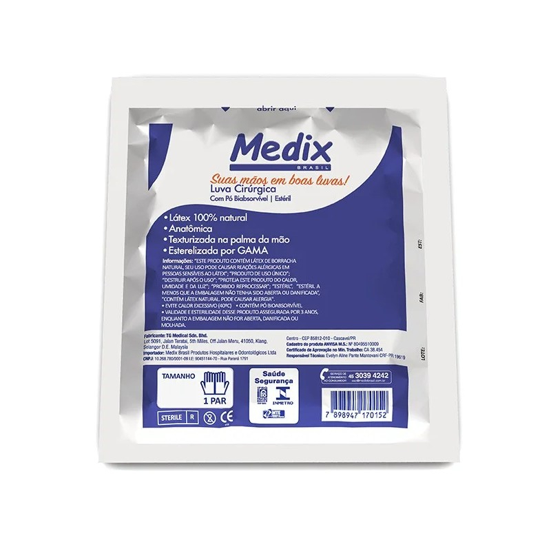 A Luva Cirúrgica Látex Estéril com Pó Medix CA 43251 é um EPI essencial desenvolvido para garantir proteção, assepsia e segurança em procedimentos médicos e odontológicos. Produzida em látex de borracha 100% natural, a luva oferece excelente elasticidade, sensibilidade tátil e barreira contra agentes biológicos. A presença de pó bioabsorvível facilita a colocação e remoção, enquanto a esterilização por radiação gama assegura alto padrão de higiene e controle de contaminação em ambientes clínicos.