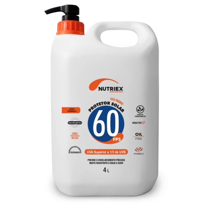 O Protetor Solar FPS 60 Corporal Nutriex Profissional foi desenvolvido para oferecer muito alta proteção contra os raios UVA e UVB, prevenindo queimaduras solares e reduzindo os efeitos nocivos da exposição prolongada ao sol. Este protetor solar profissional é ideal para trabalhadores expostos a ambientes externos, combinando tecnologia avançada com eficácia comprovada. Sua fórmula com Bioactive E® atua como poderoso antioxidante, prevenindo o envelhecimento precoce e minimizando danos causados pela radiação infravermelha. Com textura leve, rápida absorção e toque seco, não deixa resíduos esbranquiçados na pele, garantindo conforto durante todo o uso.